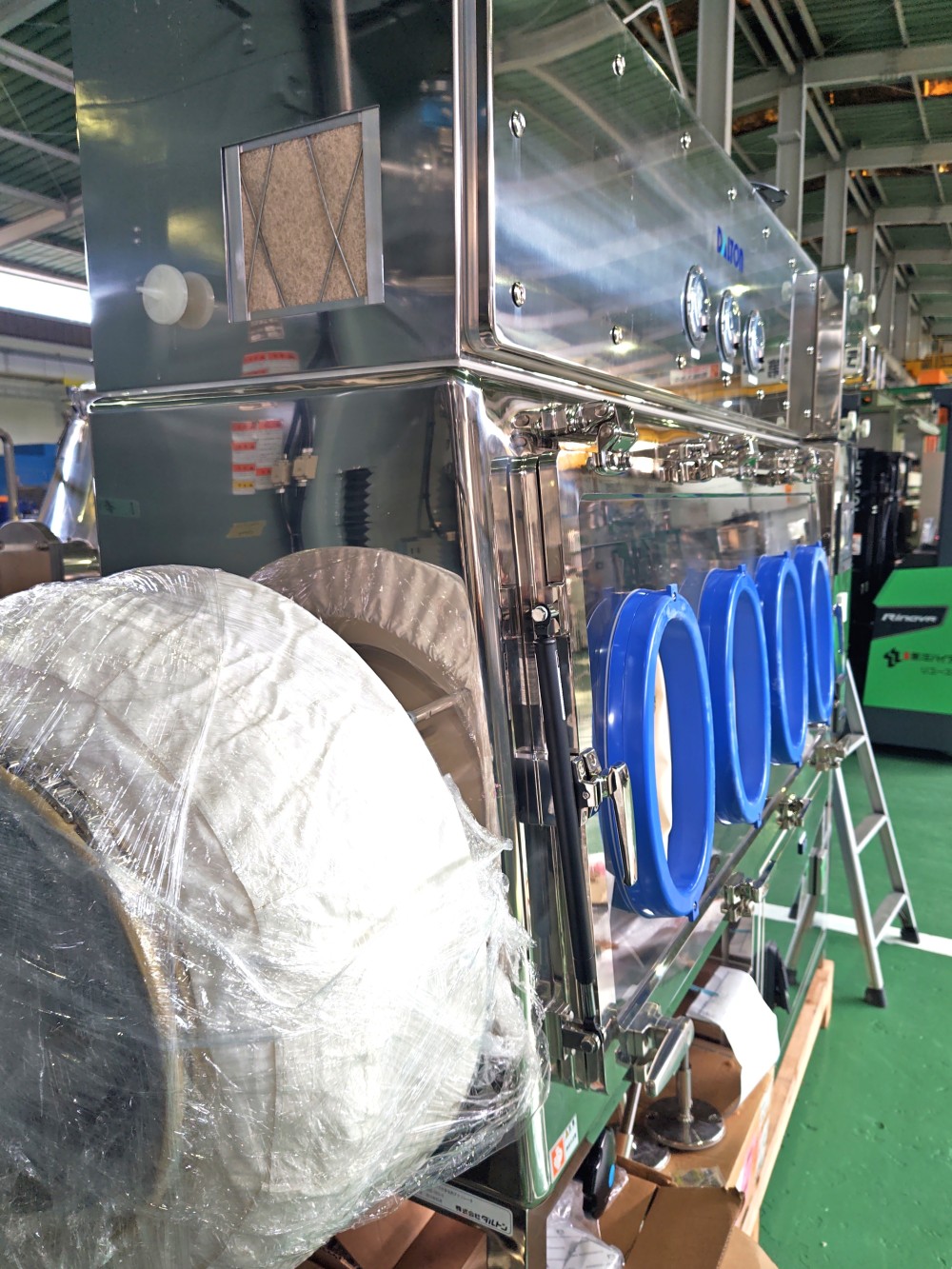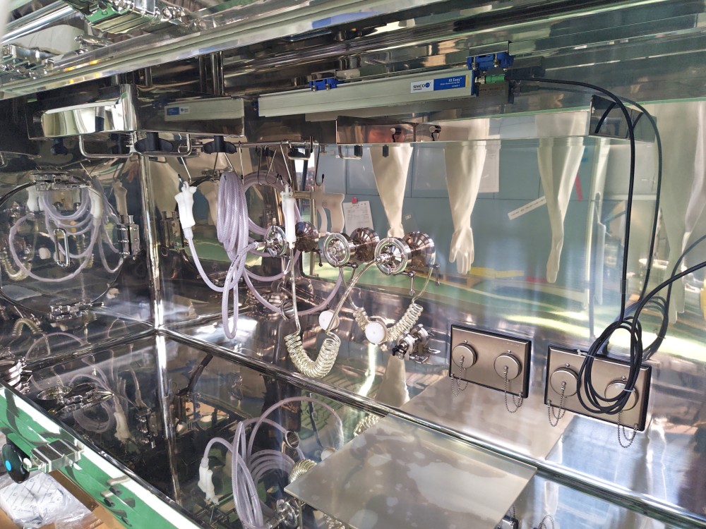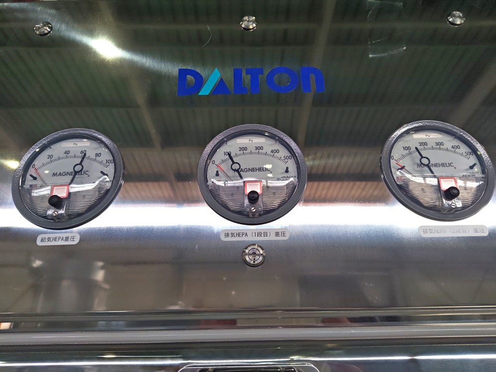 | 仕様 | 排気風量:30m3/h(通常)、24m3/h(低湿モード)、120m3/h(緊急時) アイソレータ内圧:-50Pa(設置室を基準として) 非作業時洗浄度:クラス100,000相当 グローブポート取付個数:4個 |